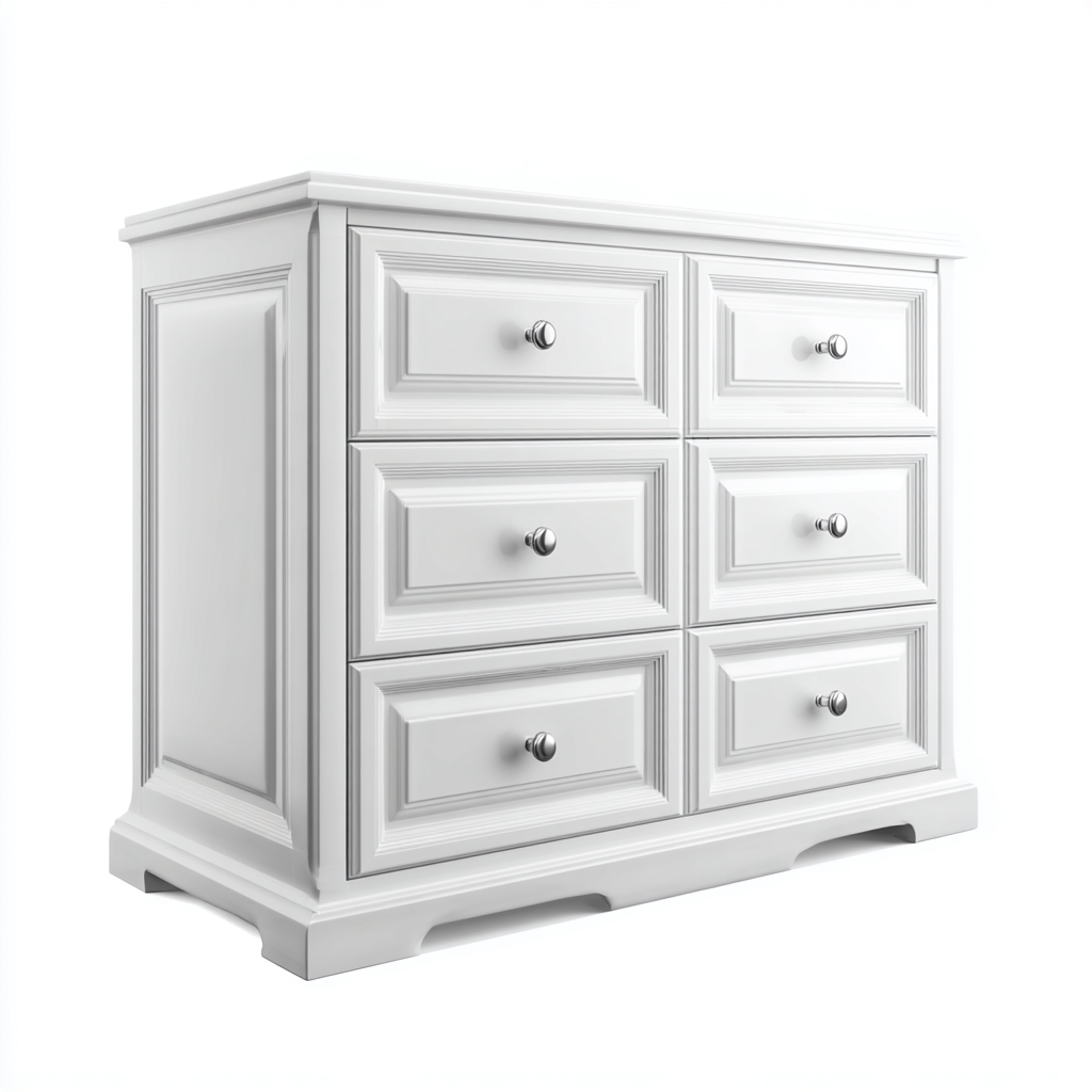 Questa cassettiera presenta una struttura ampia e ben proporzionata, ideale per l'organizzazione di indumenti e oggetti personali nella camera da letto. Il design classico con cornici sagomate conferisce un aspetto elegante e ordinato all'ambiente.