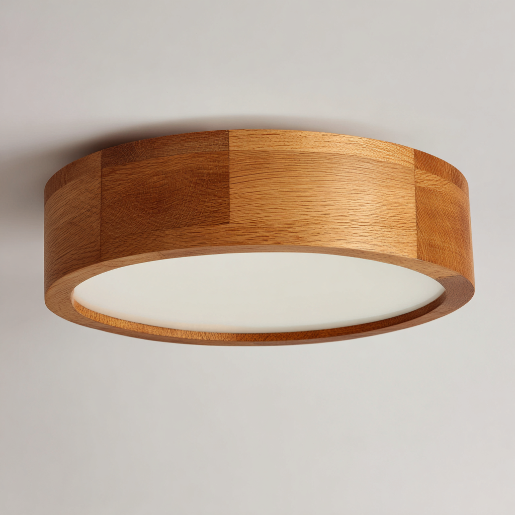 Installazione a soffitto con ingombro ridotto, adatta anche a spazi con altezza limitata. Il corpo in legno contribuisce a creare un'atmosfera calda e accogliente, mantenendo una resa luminosa equilibrata per l'uso quotidiano.