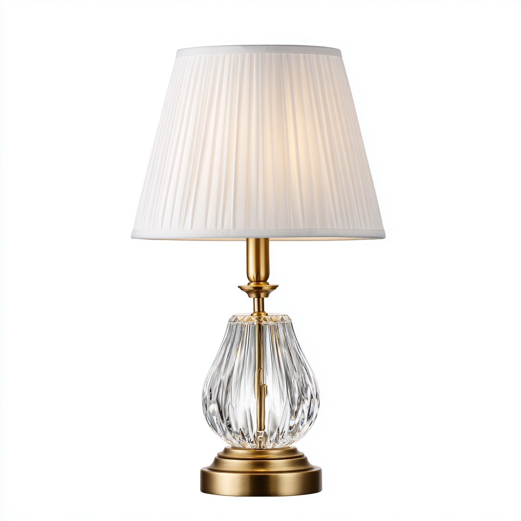 La base è realizzata in cristallo trasparente con superficie sfaccettata, studiata per riflettere la luce in modo delicato. La struttura è in metallo con finitura color oro. Il paralume è in tessuto bianco plissettato, pensato per una diffusione uniforme della luce.